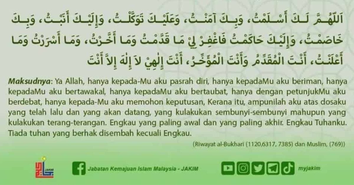 Allahumma laka aslamtu, Wa bika amantu, Wa ‘alaika tawakkaltu, Wa ilaika anabtu, Wa bika khoshomtu, Wa ilaika haakamtu fagh-firlii maa qaddamtu wa maa akhkhartu, Wa maa asrortu wa maa a’lamtu, Antal muqaddimu wa antal muakhiru. La ilaaha illa anta.